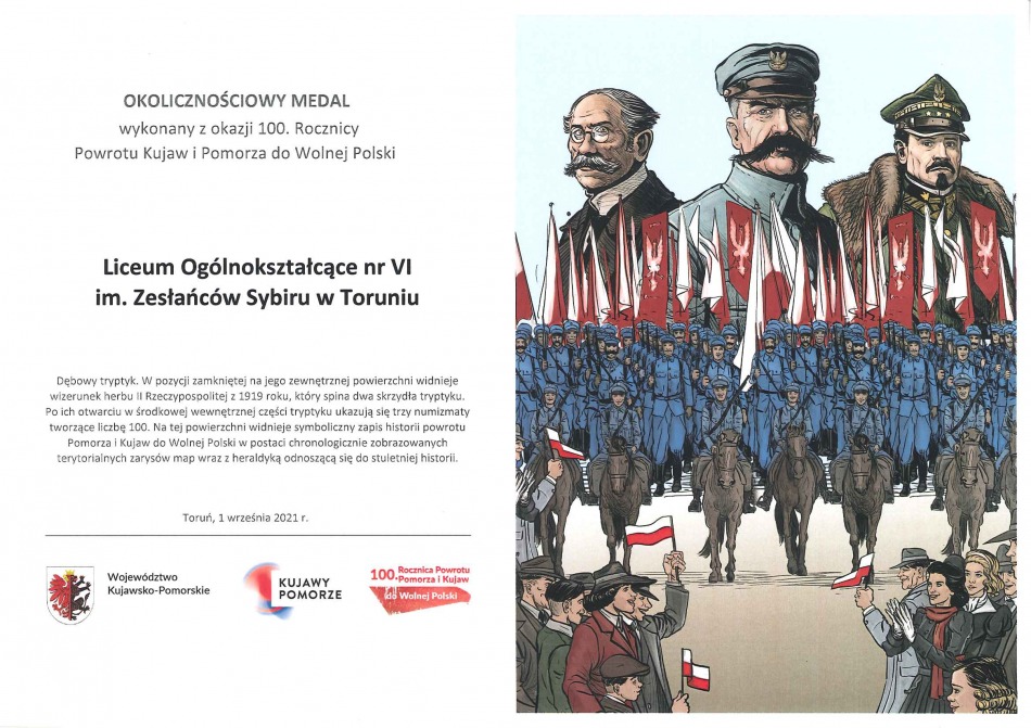 Dnia 1.09.2021r. Marszałek Województwa Kujawsko-Pomorskiego wręczył medale okolicznościowe wykonane z okazji 100.Rocznicy Powrotu Kujaw i Pomorza do Wolnej Polski. Nasza szkoła została wyróżniona za współudział w organizowaniu obchodów rocznicowych w Toruniu i Golubiu-Dobrzyniu i Pucku. Podczas obchodów w Toruniu, uczniowie klasy mundurowej uczestniczyli w inscenizacji historycznej wkroczenia Błękitnej Armii gen. Hallera do Torunia , w charakterze oddziału piechoty.