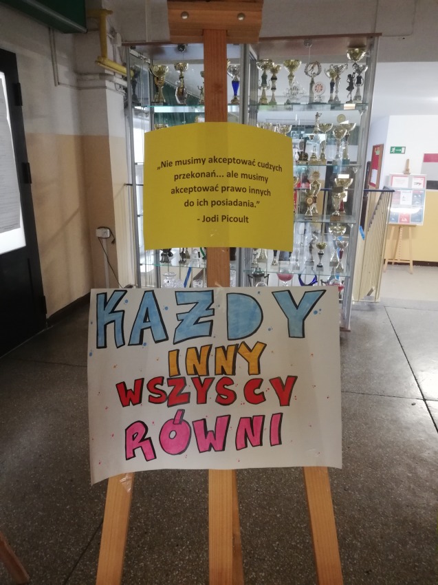 Uczniowie przygotowali plakaty, które zdobiły korytarz szkolny.  Wszyscy mogli wylosować sobie hasło dotyczące obchodzonego święta,  przygotowane przez pedagoga szkolnego. Wylosowane sentencje były głośno odczytywane przez młodzież i nauczycieli. Podczas dużej przerwy rozbrzmiewała muzyka,  podkreślająca wagę tego przedsięwzięcia. Jako pierwsza wybrzmiała piosenka S. Sojki, pt.: ”Tolerancja”. Drzwi do sal lekcyjnych  oklejone zostały kolorowymi kartkami, na których widniały hasła, mówiące o  akceptacji, szacunku, uznaniu różnorodności kultur i odmienności. W obchody tego dnia włączył się także Samorząd Uczniowski, który zachęcił młodzież do ubioru w kolorze zielonym, na znak tolerancji.