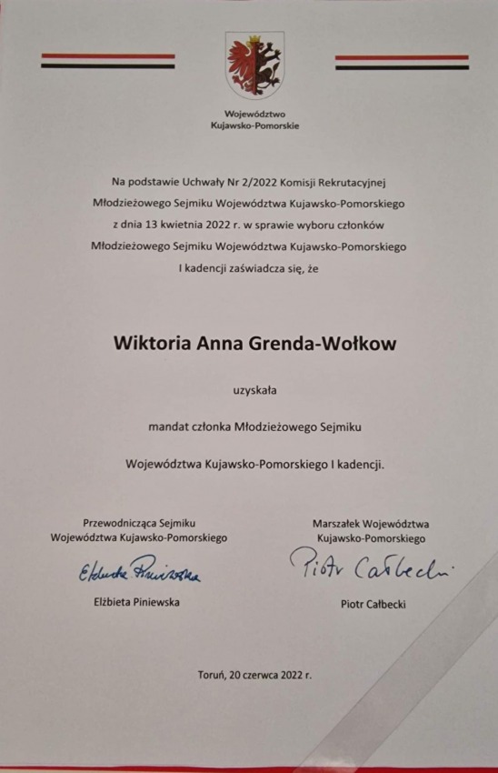 Wczoraj odbyła się I Sesja Inauguracyjna Młodzieżowego Sejmiku Województwa Kujawsko-Pomorskiego, podczas której uczennica klasy 3ap Wiktoria Grenda-Wołkow uzyskała mandat członka Młodzieżowego Sejmiku Województwa Kujawsko-Pomorskiego. Gratulujemy!