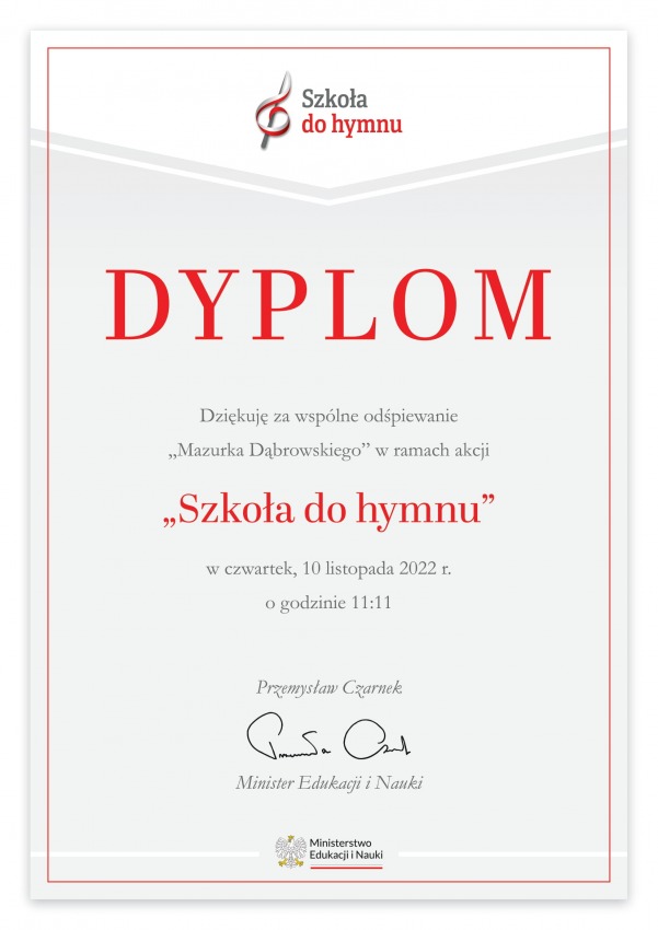 Pan Minister Edukacji i Nauki Przemysław Czarnek podziękował nam za udział w akcji „Szkoła do hymnu”. W tegorocznej inicjatywie wzięło udział blisko 20,5 tys. przedszkoli, szkół i placówek oświatowych z kraju oraz prawie 360 placówek polonijnych z całego świata.