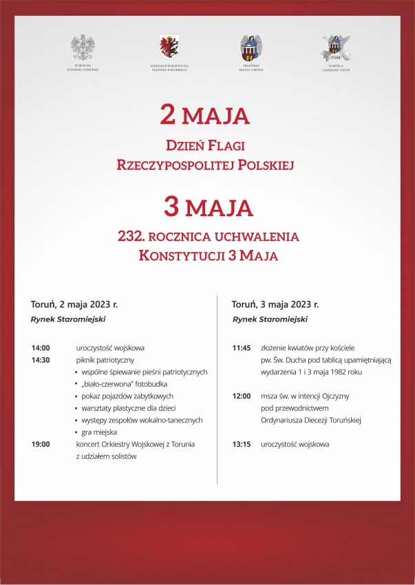 W imieniu Wydziału Promocji i Turystyki Urzędu Miasta Toruń zapraszamy na obchody Dnia Flagi RP (2 maja) oraz 232. rocznicy uchwalenia Konstytucji 3-go Maja.