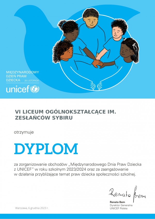 2023-12-06DYPLOM - UNICEF 2023VI LO otrzymało Dyplom za zorganizowanie "Międzynarodowego Dnia Praw Dziecka z Unicef 2023"
