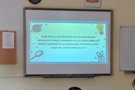 Uczniowie podczas zajęć zapoznali się z rysem historycznym zjawiska, mającego ogromne znaczenie w historii nauki. Ruchy Browna to obserwowalne, chaotyczne ruchy  bardzo małych cząstek zawieszonych w ośrodku. Ich odkrycie dostarczyło pierwszego przekonującego dowodu na istnienie cząsteczek i atomów. Teoria ruchów Browna znajduje wiele zastosowań w różnych dziedzinach, niekoniecznie związanych z fizyką, np. biologia, ekologia, matematyka, nauki społeczne.