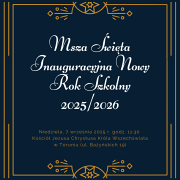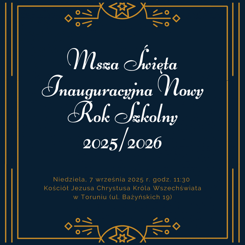 Drodzy Uczniowie, Szanowni Nauczyciele i Wychowawcy, jako nowy katecheta w naszej szkole serdecznie zapraszam Was na Mszę Świętą inaugurującą rok szkolny 2025/2026, która odbędzie się w niedzielę 7 września 2025 o godz. 11:30 w kościele Jezusa Chrystusa Króla Wszechświata w Toruniu (ul. Bażyńskich 19). Podczas wspólnej modlitwy będziemy prosić o dary Ducha Świętego, siłę i światło dla uczniów, nauczycieli oraz całej społeczności szkolnej, aby nowy rok przyniósł wiele dobrych owoców.